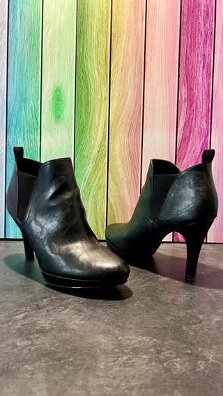 Botines de tacón en color negro, talla 38. Un básico para tu armario. - Tacón de 9 cm. - Plataforma 1 cm - Diseño tipo chelsea con elásticos laterales. los vendo porque no puedo ponerme tacones