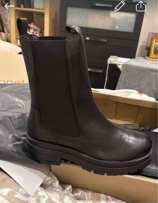 Botines negros con un diseño moderno y cómodo. - Plataforma gruesa para mayor altura. - Diseño tipo Chelsea con elásticos laterales. - Material de ante sintético. - pequeño deterioro en el interior