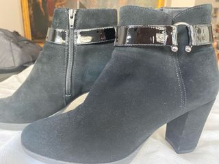 Botines de piel negra combinada con ante. Talla 42. Cierre con cremallera lateral. Son Total Flex es decir que tienen flexibilidad. El tacon mide 9cm pero tiene una plataforma de casi 2cm. Sólo me los he puesto 1 vez. Perfectos y comodisimos.
