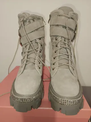 Botas de ante con un diseño trenzado y detalles de pedrería en la suela. - Cierre con cordones y cremallera lateral. - Dos correas con hebillas decorativas. - Suela gruesa con plataforma. Se envian sin caja.