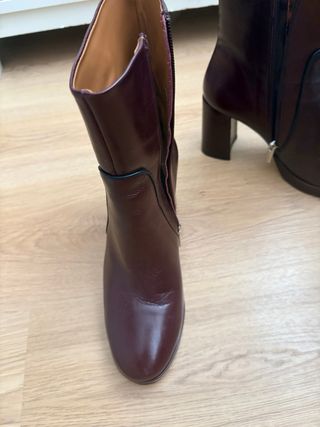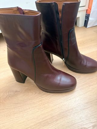 Botines de estilo moderno con tacón y plataforma. - Color burdeos/granate. - Diseño elegante. Marca portuguesa. -talla 39, calza casi un 38-38,5, por eso los vendo. Los compré en Sapartoo pero tardé en estrenarlos, ya no podía devolverlos y me van pequeños. Los he estrenado en casa, por eso las arruguitas...quería que me cupieran... -puro cuero dentro, fuera y suela. -taconazo. Plataforma. -muy estilosos y cómodos, si no te aprietan🤷♀️