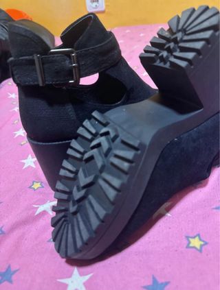 En color negro con pequeña plataforma de 2 cm y suelas track con un tacón de 5 cm Cierre cremalleras en parte interior Con pequeños signos de uso leves