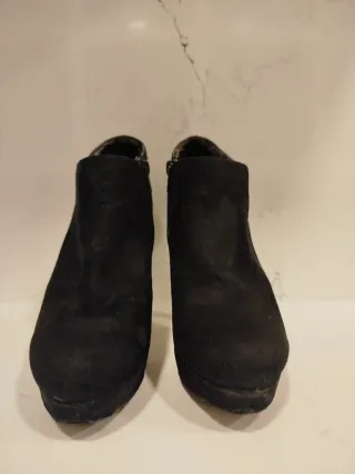 Botines bajos de ante con tacón y plataforma. - Tacón grueso y cuadrado. - Punta afilada. - Cierre de cremallera lateral. - Plataforma - Elegantes que sienta muy bonito a la pierna - Para vestir con falda o pantalon Estan nuevos, dos puestas y sin horas ni andar con ellos. Tapas y suelas perfectas y sin forma de pisada. Precio nuevo 128€