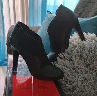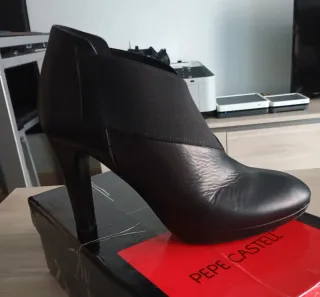 Botines de tacón de piel de la marca Pepe Castell en color negro. Forrados de piel. Estilizan la pierna. Usados 1 día. Caja original. Altura del tacón 10 cm. Comodisimos gracias a la pequeña plataforma. - Diseño elegante y moderno. - Material exterior e interior de piel. - Cierre elástico lateral.