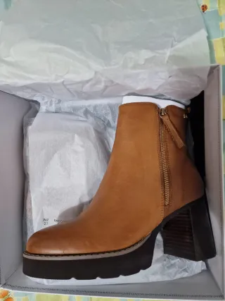 Botines de estilo moderno con tacón y plataforma. - Color burdeos/granate. - Diseño elegante. Marca portuguesa. -talla 39, calza casi un 38-38,5, por eso los vendo. Los compré en Sapartoo pero tardé en estrenarlos, ya no podía devolverlos y me van pequeños. Los he estrenado en casa, por eso las arruguitas...quería que me cupieran... -puro cuero dentro, fuera y suela. -taconazo. Plataforma. -muy estilosos y cómodos, si no te aprietan🤷♀️