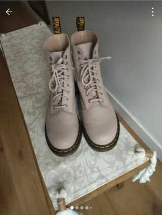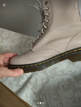 Botines Dr.Martins. talla cuarenta tallan bien son de piel 100% son las de piel blandita y no son de plataforma la suela es la normal sin duda un clásico atemporal son en tono taupe entre un beige con su tono grisáceo y los agujeritos en dorado claro. Solo venta en mano. - Diseño clásico de Dr. Martens. - Parte superior de cuero. - Suela con costuras amarillas características.
