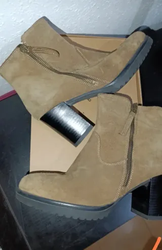 Botines de ante con plataforma y tacón de madera. - Material exterior: ante. - Detalle de tachuelas metálicas alrededor de la plataforma. - Diseño tipo chelsea con elásticos laterales. - Tacón de 12 cm y plataforma de 4 cm. Puestos en 3 ocasiones. Precio original 80 euros.