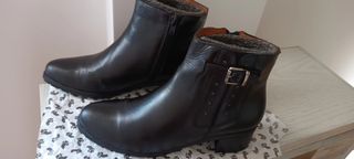 Botines de piel con un diseño elegante y moderno. - Cierre con cremallera lateral. - Detalle de hebilla y tachuelas decorativas. - Interior forrado para mayor comodidad. - Suela resistente. - Precio tienda 125€ - No Negociable.