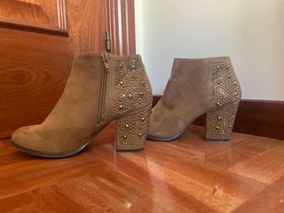 Botines de ante y tacón , con tachuelas y flecos. Usados en muy pocas ocasiones. El color es marrón claro.