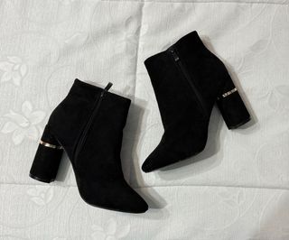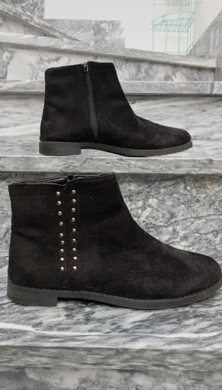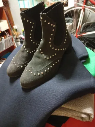 Botines de ante con un diseño moderno y elegante, perfectos para completar cualquier look. Solo usados una vez - Detalle de tachuelas plateadas. - Tacón grueso para mayor comodidad. - Material: Ante.