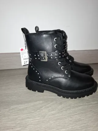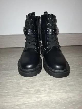Botas de niña con un diseño moderno y detalles que marcan la diferencia. - Cierre con cordones y cremallera lateral. - Correa con hebilla y tachuelas. - Suela gruesa y resistente.