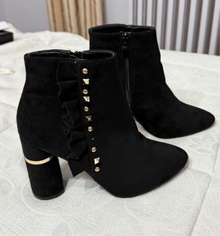 Botines negros con un diseño moderno y detalles que marcan la diferencia. - Acabado en ante. - Adorno de tachuelas doradas. - Detalle de volantes laterales. - Tacón grueso con detalle dorado. - Cierre de cremallera lateral.
