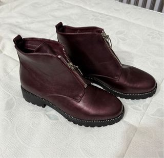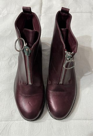 Botines de estilo moderno con un llamativo detalle de cremallera central. - Color granate con acabado brillante. - Cremallera frontal plateada con tirador. - Ribete decorativo con tachuelas en la suela. - Suela de goma con relieve.