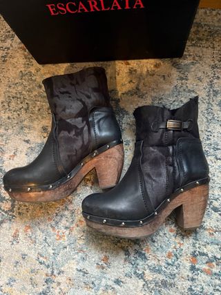 Botines de la marca Escarlata con un diseño único. - Elaborados en piel. - Tacón de madera. - Detalle de tachuelas metálicas. - En su caja original, costaron 119 euros