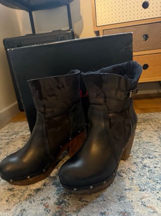 Son unos botines en color gris, con tachuelas a los lados, y con 5 cm de plataforma super cómodos. Es una talla 36, estan puestos solo una vez porque quedaban grandes. De la marca española mim, valorados en 70 euros, los dejo por 50.