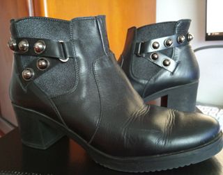 Botines marca Dansi modelo 6104 negros con cremallera y adornos de tachuelas plateadas. Tacón ancho de 5 cm. de alto. Precio originario 110€. Piel de calidad y apenas usados.