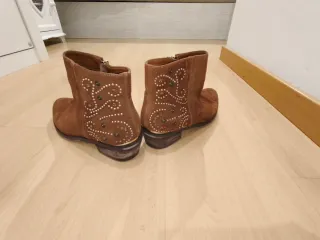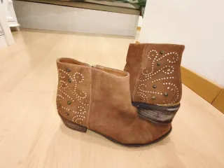Botines de serraje en color marrón, con detalles de tachuelas. - Diseño con tachuelas decorativas. - Material exterior de serraje. - Cierre con cremallera lateral. - Apenas usados, prácticamente nuevos