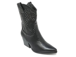 Botín elegante de color negro, con un diseño moderno y detalles que marcan la diferencia. - Banda decorativa con tachuelas plateadas. - Material exterior de cuero y de serraje. - Diseño tipo botín con tacón ancho. - Talla 39.