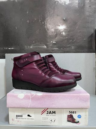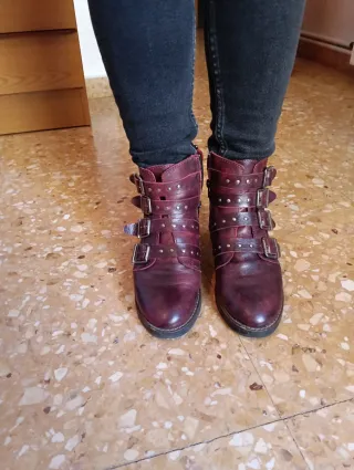 Botines de piel en color burdeos, nuevos a estrenar. SOLO ENVÍOS - Cierre con velcro y cordones elásticos. - Detalle de tachuelas decorativas. - Suela de goma negra. - Forro interior textil.