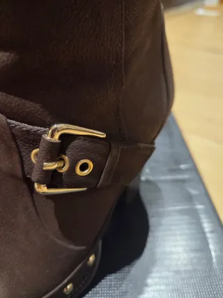 Esta semana, TIRO LOS PRECIOS!! Venta y recogida en zona Bretón de Zaragoza capital!!! En pleno centro!!! APROVECHA, SUBIRÁN DE PRECIO!! A ESTRENAR!!! Botines de estilo western con detalles únicos. - Material exterior de ante marrón. - Correa con hebilla dorada y tachuelas. - Trenzado decorativo en la caña. - Suela de plataforma con cordones y adornos. Nuevos. Ideales otoño. Preciosos botines. Han sido un regalo y por equivocación en talla, no me sirven. Por gastos de envío no me compensa su devolución.