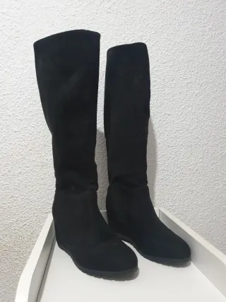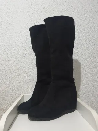 Botines largos de color negro. - Material exterior tipo ante. - Diseño de cuña. - Caña alta.