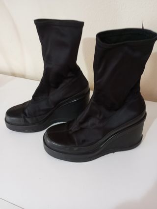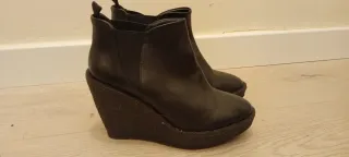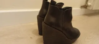 Botines cuña alta negros de Zara. Tacón bajo. En muy buen estado. Puestos tres veces. No sé andar con botines con este tipo de tacón.
