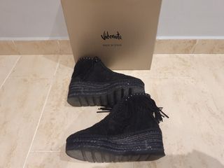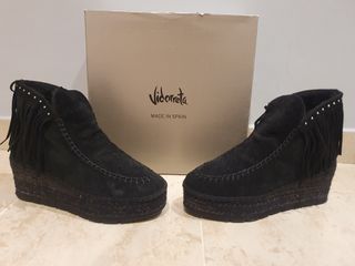 Botines en piel vuelta (ante) color negro con flecos y tachuelas. Cierre lateral con cremallera. Suelas recién cambiadas. Altura cuña 8cm. Son muy cómodos.