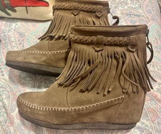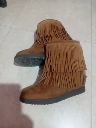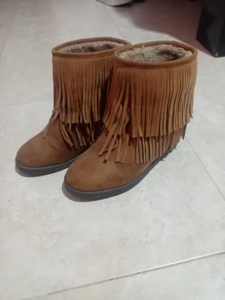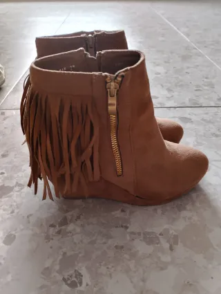 botin con cuña, color camel con detalle de flecos alrededor, no son muy altos, solo usados un par de veces