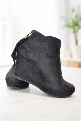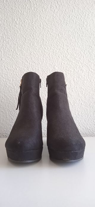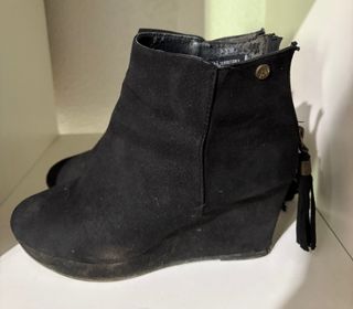 Botines negros con diseño de cuña. - Material exterior tipo ante. - Detalle de flecos en la parte trasera. - Adorno metálico en el lateral. -Son 39 pero tallan pequeños.