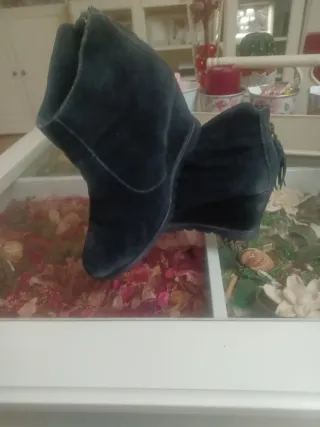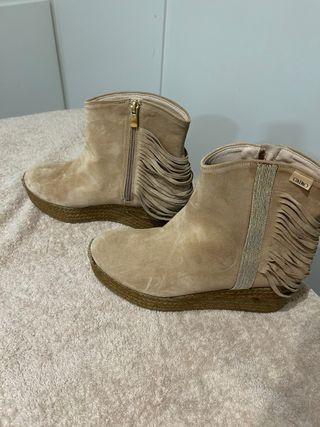 En perfecto estado. Solo un uso. Botines de cuña con detalle de flecos. - Material exterior tipo ante. - Adorno de flecos en la parte trasera. - Hebilla decorativa con correa. - Cierre de cremallera lateral.