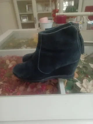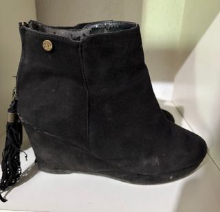 Botín de serraje con cuña interna. Tienen una puesta (se ve en la suela de la foto) porque me hacían daño. Diseño con perforaciones. Detalle de flecos y lazada en la caña parte trasera.