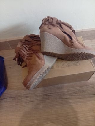 Botines marrones cuña con flecos Talla 41 aunque dan poca talla. Nuevos. Hago envíos combinados, puedes mirar mi perfil y si te interesan más cosas lo hacemos en un solo envío.