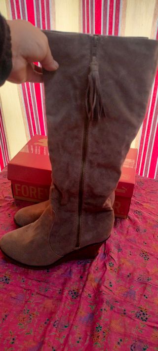 Botas altas de estilo casual. - Material exterior tipo ante. - Cremallera lateral. - Detalle de flecos en la parte superior. - Tacón de cuña.