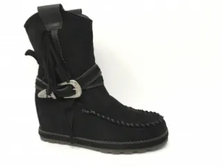 Botines de estilo western con un diseño único. - Acabado en ante. - Detalle de tachuelas metálicas. - Adorno de flecos. - Tacón con cuña.