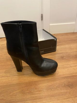 Botines con cuña de 7 cm., aunque aparentemente son planos. El pañuelo y la tira con hebilla se pueden quitar o poner al gusto. Son de la marca Chika10, talla 37. Únicamente me los he puesto una vez, los compré una talla menos por error.