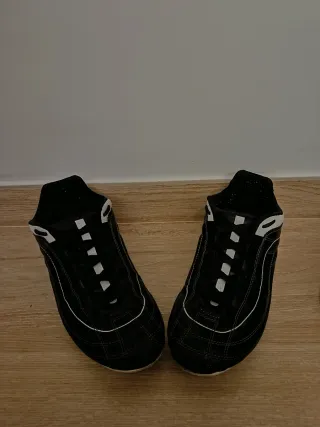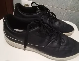 Botas de fútbol originales en color negro. - Diseño deportivo. - Con botín - Detalle de costuras. - Ribete blanco en la parte superior. - Lengüeta clásica - Una tiene la suela un poco despegada