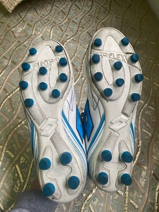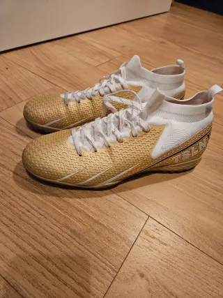Vendo botines de fútbol multitaco TSLA, talla 43, color dorado y blanco. Están usados, pero en buen estado. La suela tiene desgaste normal del uso, se puede ver bien en las fotos. Van bien para césped artificial y tierra. Son cómodos, ajustan bien al tobillo y no pesan. Los vendo porque ya no los uso. Entrega en mano o envío por Wallapop. Cualquier duda, escríbeme sin problema.