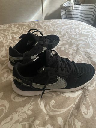 Botines de fútbol sala Nike en color negro y gris. Diseñados para un buen agarre en la cancha. - Parte superior de malla y ante. - Suela de goma. - Detalle de Swoosh perforado.