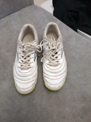 Botines para fútbol sala con un diseño moderno. - Parte superior blanca con detalles en verde. - Cierre con cordones. - Suela de goma. Están sucios