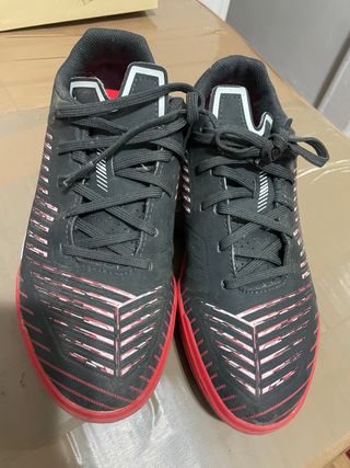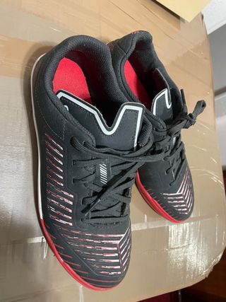 Botines de fútbol sala con un diseño moderno y llamativo. - Exterior en color negro con detalles en rojo. - Suela de goma para un buen agarre. - Cierre con cordones.