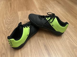Botines de fútbol Adidas en buen estado, con un diseño llamativo. - Combinación de colores negro y verde neón. - Detalle de franjas laterales. - Cierre con cordones.