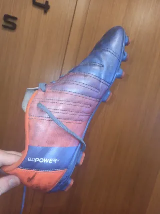 Botines de fútbol Puma Evo 4 en talla 44. Combinan azul y naranja. - Diseño deportivo. - Marca Puma.