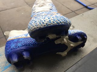 Par de botines de fútbol combinados. - Un botin Puma pie derecho en color azul con detalles en amarillo. - Un botin Nike pie izquierdo en color verde azulado tornasol detalle y cordones blancos - Ambos con diseño acolchado - Son idénticos en cuanto a tamaño, pero diferente marca y colores - Están completamente nuevos - Ambos forman 1 par de botines utilizables - El estado del par es nuevo, nunca usados. Entrega presencial, no hago envios.