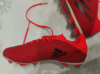 Botines de fútbol Adidas con un diseño llamativo. - Combinación de colores blanco y rojo. - Cordones negros. - Suela con tacos.