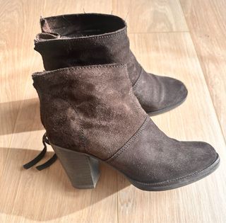 Botines de ante en color marrón chocolate. Se encuentran en buen estado. - Material: Ante - Color: Marrón chocolate - Talla: 39 - Tacon de 7 cms