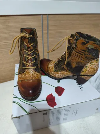 Botines únicos y peculiares de piel. - Diseño patchwork con múltiples texturas. - Cierre de cordones y cremallera lateral. - Tacón de altura media. - Detalles de costuras y adornos metálicos. -Los vendo muy a pesar mío porque me han operado los pies y se me acabó cualquier tacón.