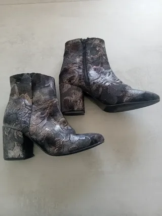 Botines de piel con un diseño estampado en tonos grises y plateados. Tienen un tacón grueso y punta afilada. - Diseño floral. - Cierre de cremallera lateral.