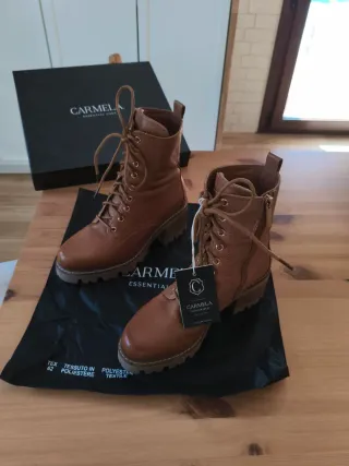 Botines de piel de la marca Carmela en color marrón/ brandy. Cuentan con cordones y cremallera lateral para facilitar su uso. - Material exterior: Piel. - Cierre: Cordones y cremallera. - Suela: Goma. - Detalle de cremallera con logo de la marca. Se las puso mi hija un día.