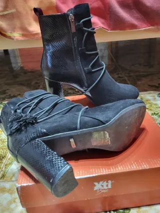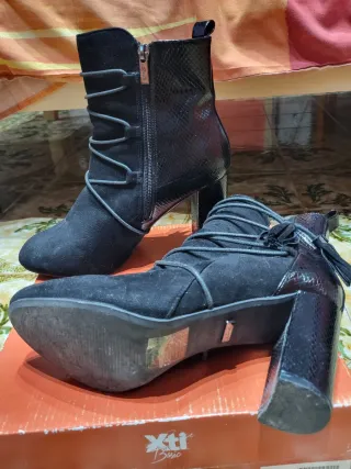 Botines elegantes con un diseño moderno. - Acabado imitación piel de serpiente en el tacón y la puntera. - Cierre de cremallera lateral. - Detalle de cordones en la parte delantera. - Tacón grueso para mayor comodidad y estilo. - Marca española