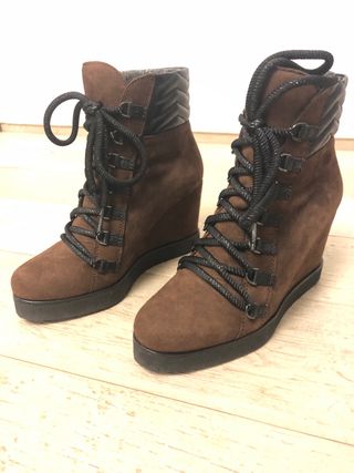 Botines de ante en color chocolate. - Cierre con cordones negros con toques metalizados. - Detalle acolchado en la caña. - Suela de plataforma negra. - Tacón de cuña. - Forro de piel.